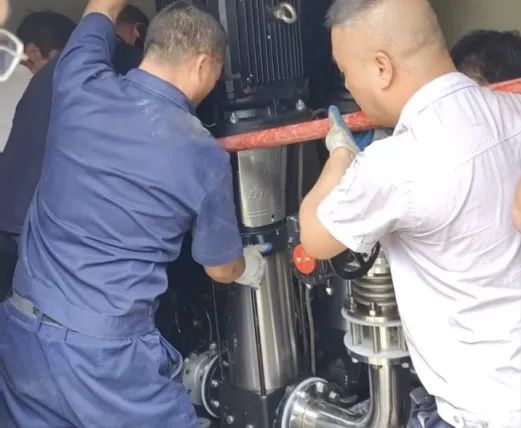 新水泵功率大,重量也非比尋常的設(shè)備,單臺(tái)泵重達(dá)1000斤,而泵房位置偏僻且面積狹小,無法進(jìn)行叉車、吊機(jī)等設(shè)備作業(yè),所有設(shè)備搬運(yùn)與安裝都只能靠單一的人力來完成。困難面前,運(yùn)維中心的工程師們迎難而上,他們利用鍍鋅管、鋼繩等簡單工具,肩挑手抬,吆喝著號(hào)子,硬是通過人力將所有水泵與配套零件全部安裝到位。